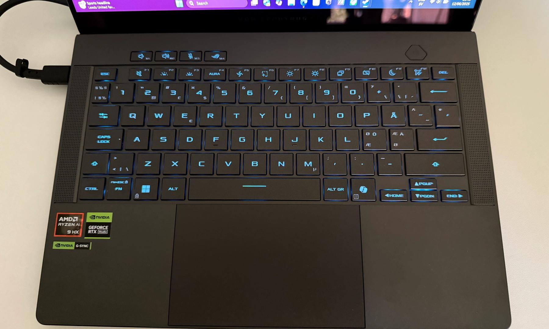 Det jag har lagt märke till på andra modeller är att tangentbordet ibland blir otroligt varmt på grund av den värme som skapas av komponenterna inuti chassit. Med ROG Zephyrus G14 2025 blir det inte varmt på tangentbordet, vilket är viktigt om du ska kunna använda det. Värmen som skapas är istället på ytan mellan tangentbordet och skärmen, se bild två för en markering.