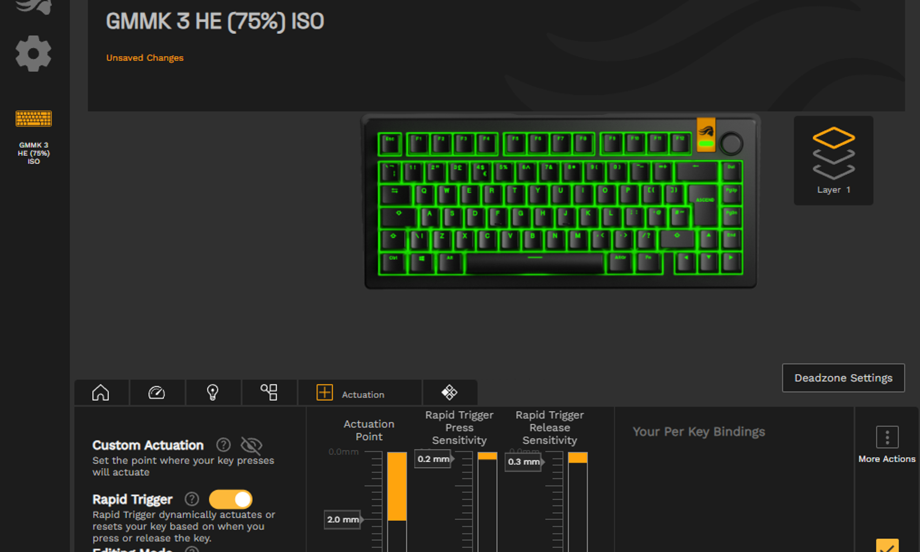 Mjukvaran Glorious CORE gör det den ska. Du kan anpassa ditt tangentbords belysning, ställa in rapporteringsfrekvens eller ingångslatens, tangentbindningar, och såklart även justera aktiveringspunkt och Rapid trigger.