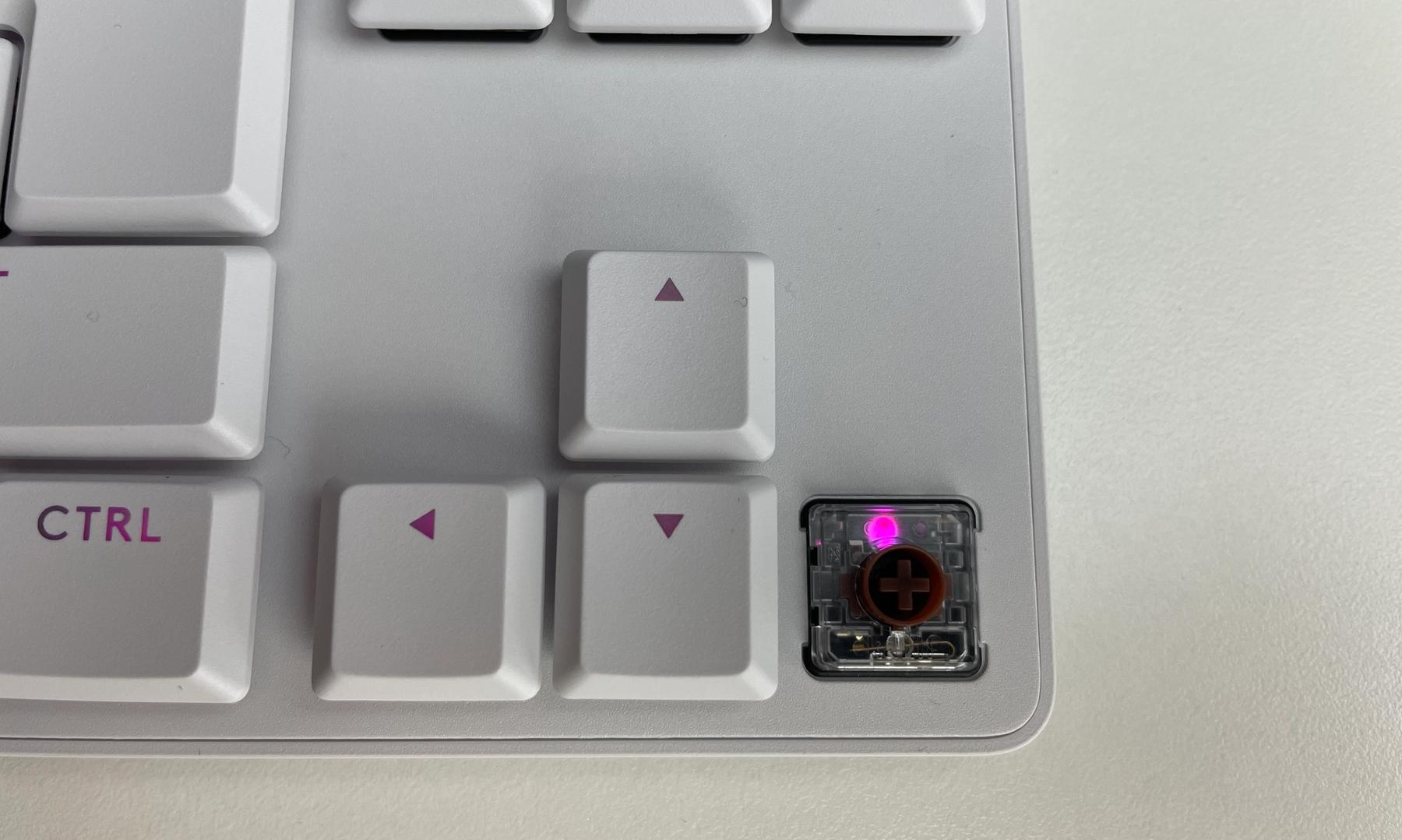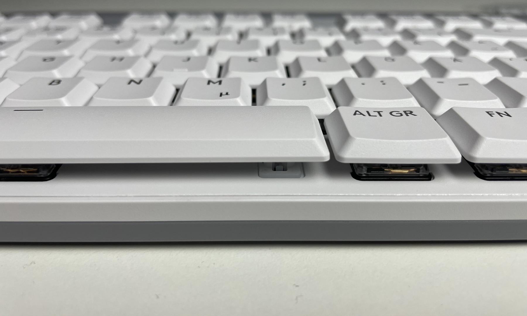 Den låga profilen innebär också en kortare aktiveringspunkt, endast 1,3 mm. Även det totala avståndet att trycka ned tangenten till botten är lägre än vanligt (3,2 mm).