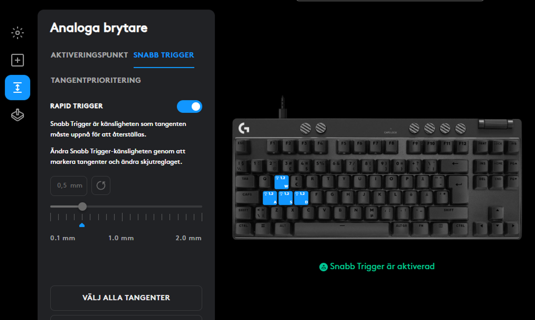 I mångt och mycket är tangentbordet väldigt likt Pro X TKL Lightspeed, men nu kommer det med häftiga funktioner och prestanda som uppnås med de analoga magnetiska brytarna. Brytarna har en linjär upplevelse och liknar på många sätt känslan hos mekaniska linjära brytare som sitter i de flesta tangentbord, med undantaget att aktiveringskraften är lägre på Pro X TKL Rapid.