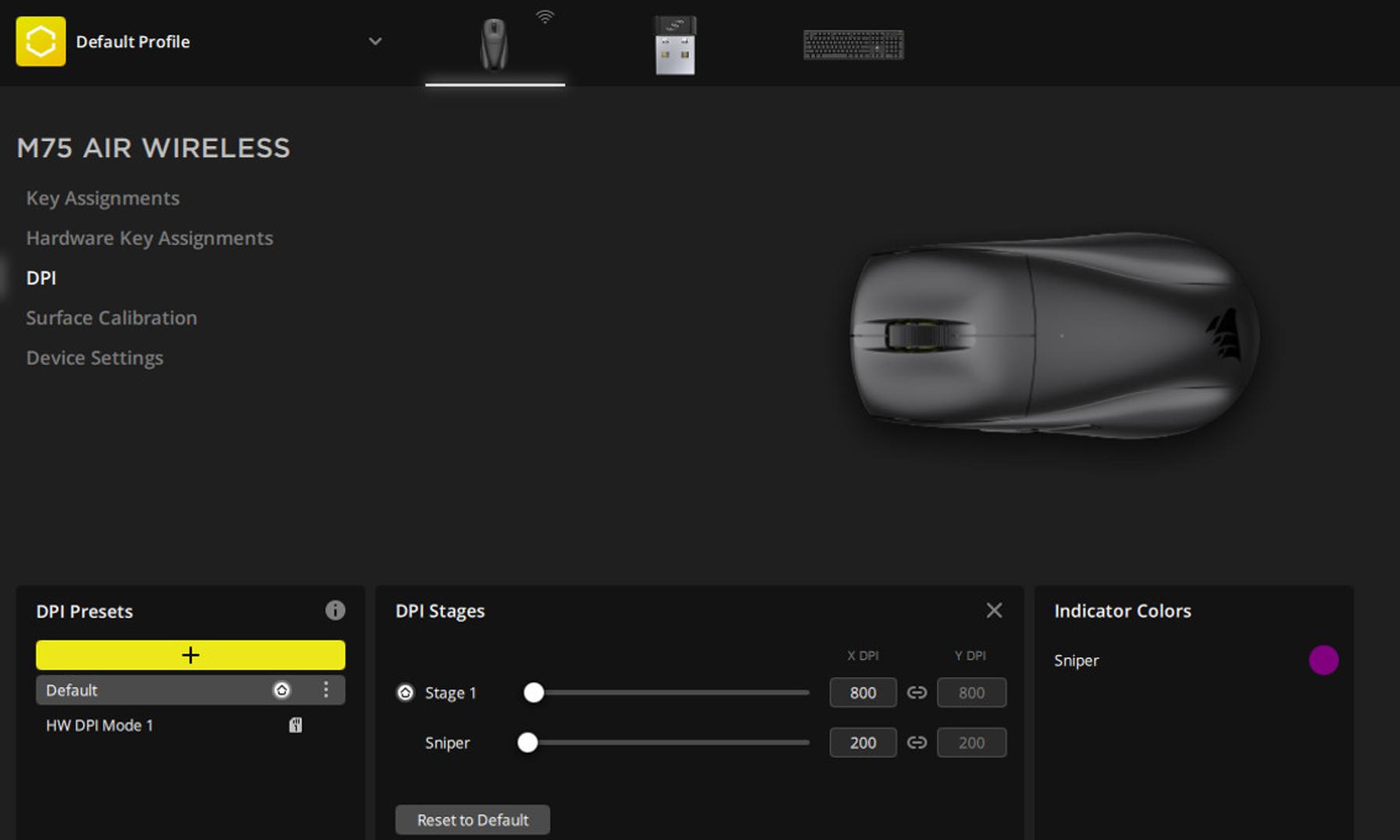 Mjukvaran iCue känns simpel och tydlig när det gäller att konfigurera M75 Air. Du kan med enkelhet spara ner de inställningar du vill spara på musens inbyggda minne. Detta betyder att du sedan inte behöver iCue om du inte vill och musen fungerar likadant på andra datorer. Detta gäller även så kallade "key assignments". Du kan till exempel byta låt på framåt- och bakåtknappar om du skulle vilja.