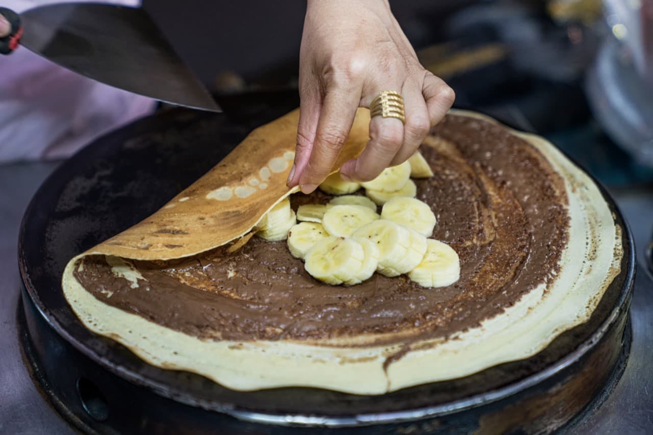 Smeten gör du på nästan samma sätt oavsett om det är crêpe eller pannkaka du ska göra. Smält smöret och låt det svalna. Blanda mjöl och salt i en bunke. Lägg till sockret om du vill ha det. Mixa ner hälften av mjölken i bunken så att det blir en slät smet utan klumpar. Därefter vispar du ner resten av mjölken och sedan äggen. Häll i äggen ett i taget.