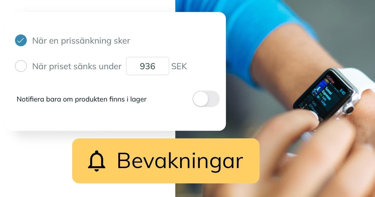 Du behöver inte hålla koll på butikernas prissänkningar. Vår smarta prisbevakning gör jobbet åt dig helt automatiskt. Vi informerar dig när dina bevakade prylar blir billigare och funktionen är helt gratis att använda. Välj om du vill få ett mejl eller en avisering i mobilen med vår app.