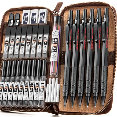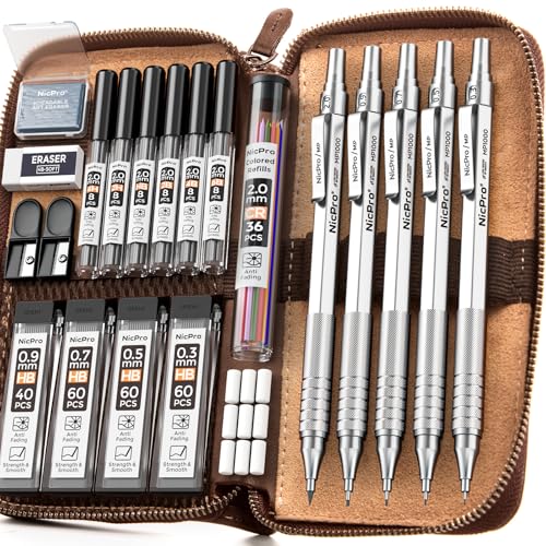 Nicpro 20 st metallmekaniskt pennset i läderfodral, 0,3, 0,5, 0,7, 0,9 mm och 2 mm blypennhållare, 9 rör (4B 2B HB 2H) blypåfyllningar (svart och färger), suddgummin för konstritning skissning