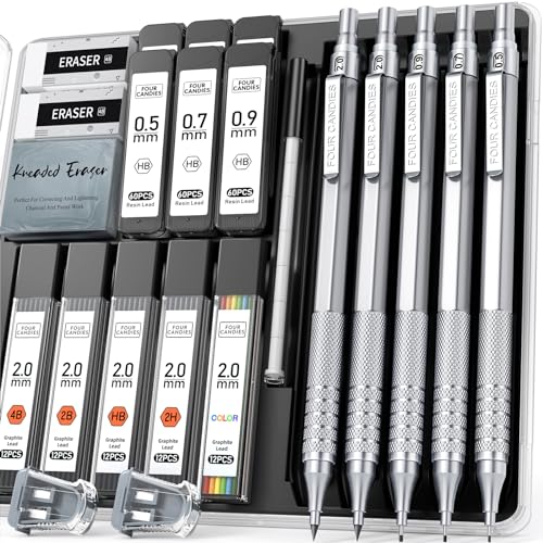 Four Candies metalltryckblyertspenna, 3 stycken konstgruv-pennor 0,5, 0,7, 0,9 mm & 2 stycken 2 mm blyertspennor med 420 stycken påfyllningar (4B, 2B, HB, 2H färger) för att skriva och rita (svart)
