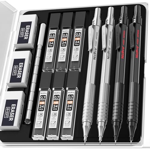 Nicpro 4-pack mekaniska pennor 0,5 mm och 0,7 mm med fodral, MP1000 metallkonstpennset med 8 rör HB och 2B blypåfyllningar, 3 radergummi, 9 radergummi, för konstskrivning, ritning, svart och silver