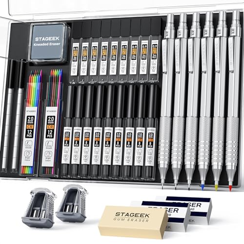STAGEEK 35 st mekaniska pennset med svart konst i fodral, 0,5 0,7 0,9 2,0 grafit metallritpennor, pennvässare radergummin 384 st blypåfyllningar (6B 4B 2B HB 2H 4H färger) för att skriva skissning