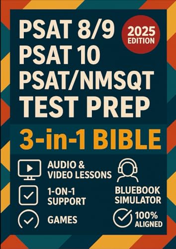 PSAT 8/9 + PSAT 10 + PSAT/NMSQT Test Prep (3-in-1 Bible): 9 Full Practice Tests, Official-Style Bluebook Simulator, Audio & Video Lessons, 100% Aligned + Games, Checklists, 1-on-1 Support