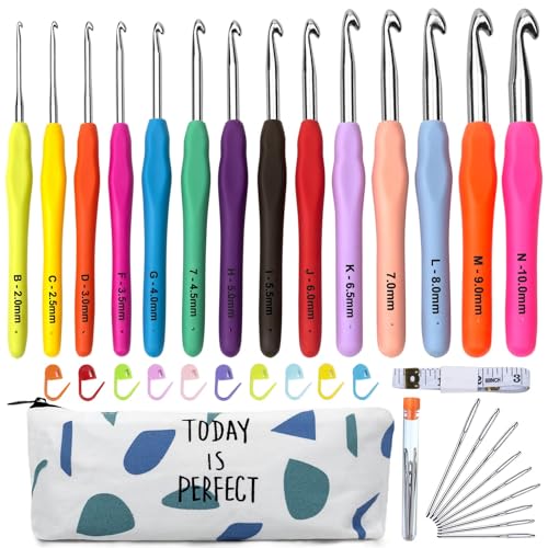 Set med virknålar, 14 st mjuka handtag sticknålar kit + 10 st virkade lås + 9 stora ögon hand sykrokar + 1 152 cm mått+virknålsfodral, idealisk