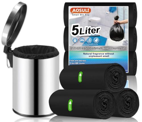 AOSULI 5 L små soppåsar 69 st sopsäckar svart soptunna/sopsäckar för kök, hem, kontor, badrum, gräsmatta, trädgård, uteplats (passar 0,8, 1,5, 1,2 gallon tunnor, 3 rullar