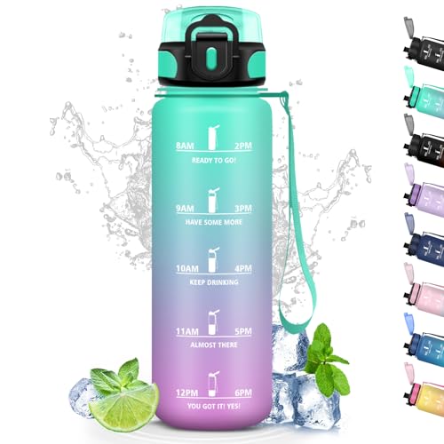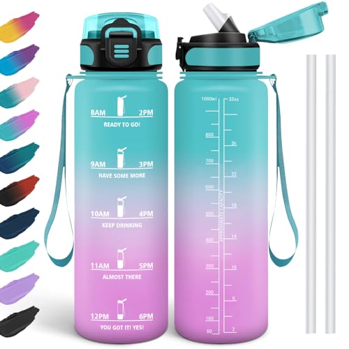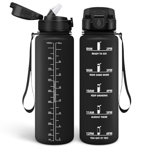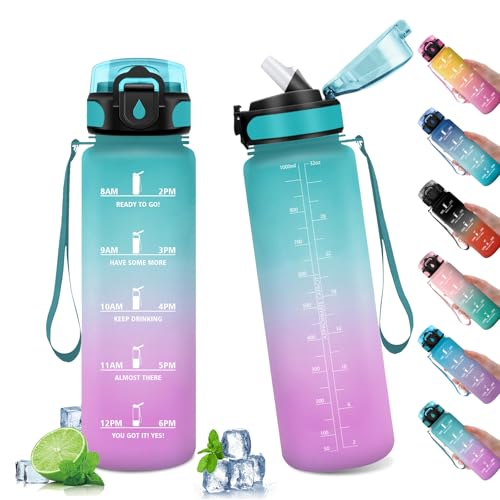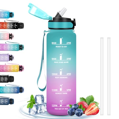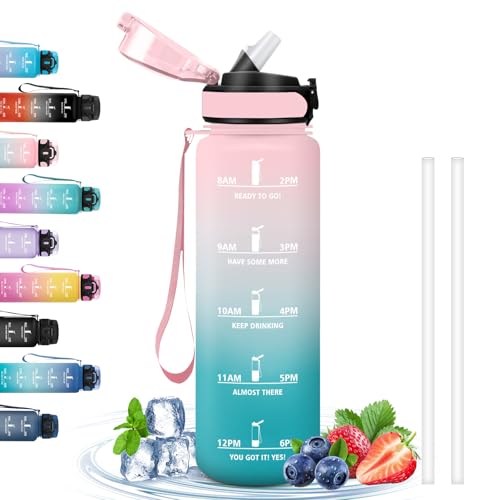 Grsta 1 liter, vattenflaska för gym, förlustfri, motiverande vattenflaska med tidsskala, flaska med sugrör, lätt att rengöra, flaska för sport, fitness, vandring, cykling