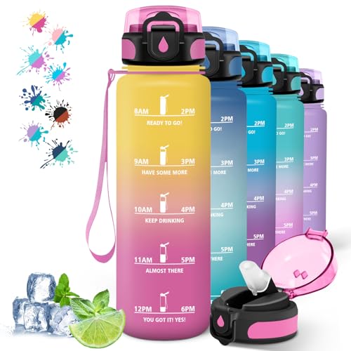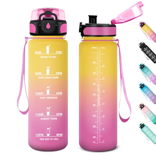 Flaska, 1 liter vattenflaska, läckagefri, gymflaska med sugrör, lätt att bära, vattenflaska med drickstid, för cykling, yoga, vandring, gul-rosa