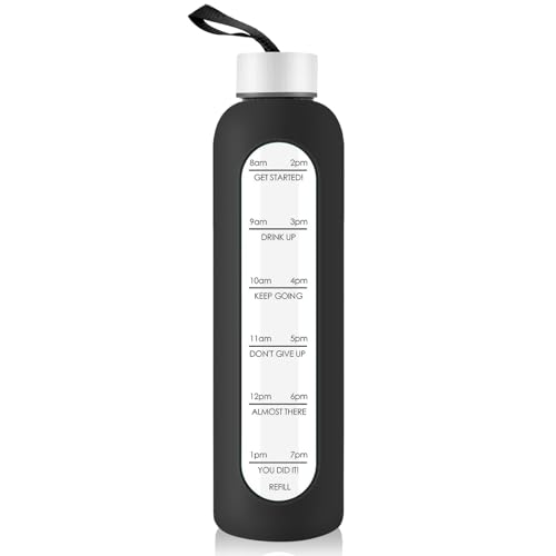 1 liter vattenflaska i glas med lock i rostfritt stål – 1 000 ml sportflaska med tidsmarkör, återanvändbar okrossbar silikonväska flaska för fitness, gym, utomhus, resor, träning (svart)