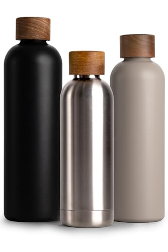 T&N rostfri dricksflaska i stål 1L, 750ml, 500ml, termosflaska med akaciaträlock, flaska 1 liter, isolerad vattenflaska läckagesäker kolsyra lämplig, isoleringsflaska 1000ml