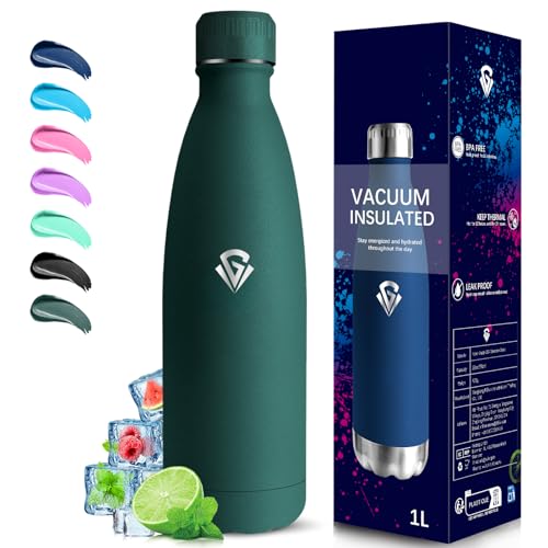 Grsta Termisk flaska, 1 liter vattenflaska, läckagesäker rostfritt stål, termisk flaska, gymflaska, BPA-fri, lätt att rengöra, vakuumisolerad, metallflaska för sport, resor