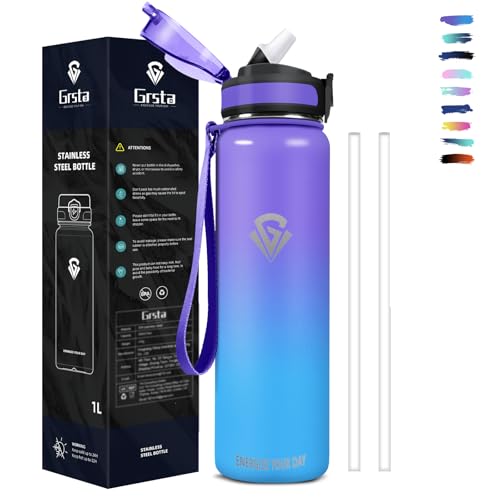 Grsta Termisk flaska, 1 liter vattenflaska, vattenflaska med sugrör, BPA-fri, vakuum med dubbelvägg, läckagesäker stål termisk vattenflaska, metallflaska för sport, camping, gym