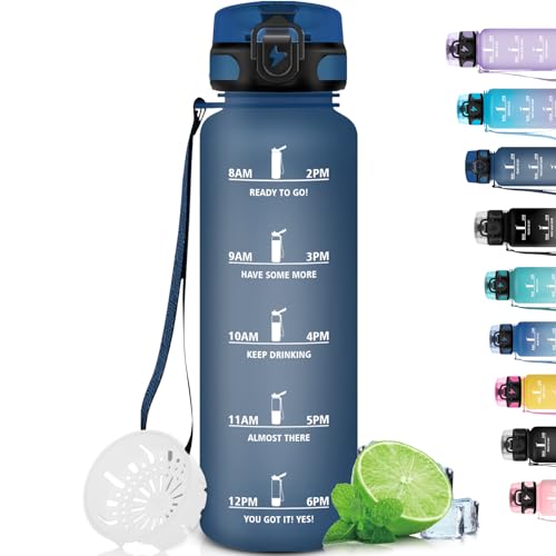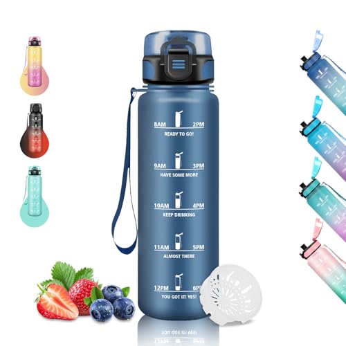 Grsta Vattenflaska 1 liter flaska med filter, läckagefri cykelflaska, vandringsflaska, lätt att bära, flaska med drickstider, för sport, gym, vandring, marinblå