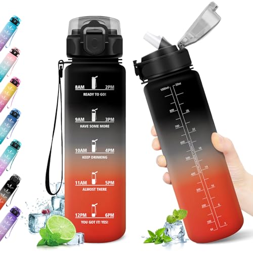 Grsta 1 liter, vattenflaska för gym, förlustfri, motiverande vattenflaska med tidsmässig skala, flaska med sugrör, lätt att rengöra, vattenflaska för sport, fitness, cykling, svart-röd