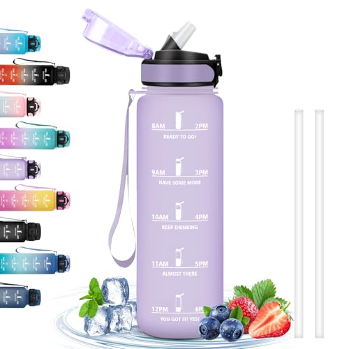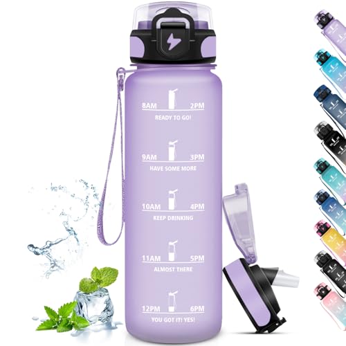 Flaska, 1 liter flaska, lätt att bära, läckagefri gymflaska, sugrör, flaska med sugrör, för vuxna, vattenflaska med drickstid, för sport, cykling, vandring, yoga, lila