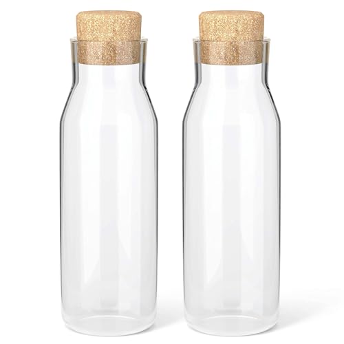 HEFTMAN Uppsättning av 2 glaskaraff, 1 liter, klar glasflaska för varma och kalla drycker, vattenkaraffglas med korklock, påfyllningsbara tygmjukgörarburkar med propp, förpackning med 2