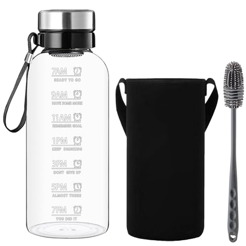 DEARRAY 1,5 liter vattenflaska i glas med sugrör och tidsmärkningar 1,5 l stor läckagesäker motiverande glasflaska stor glaskanna med lock bpa-fri glaskaraff