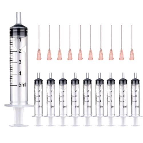 Förpackning med 10 st x 5 ml spruta och 10 x kanylspruta set med trubbiga nålar, olika storlekar: 1 ml, 3 ml, 5 ml, 10 ml, 20 ml, 30 ml, 60 ml, för hobby och gör-det-själv, individuellt sterilt