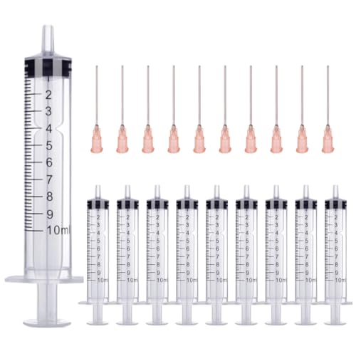Förpackning med 10 st x 10 ml spruta och 10 x kanylspruta set med trubbiga nålar, olika storlekar: 1 ml, 3 ml, 5 ml, 10 ml, 20 ml, 30 ml, 60 ml, för hobby och gör-det-själv, individuellt sterilt