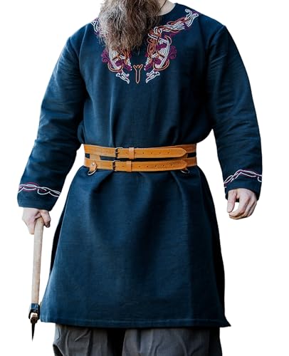 Leonardo Carbone® viking tunika Njal – medeltida kläder män, medeltida skjorta, fritidsskjorta kortärmad, karnevalkostym män, vikingtunika, LARP-kläder – 100 % bomull, blå, M