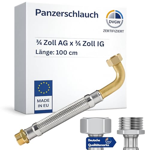 DVGW gep. Pansarslang 3/4–1 tum 30–150 cm, flexslang, DN25 & DN19, vattenanslutning, uppvärmning, mjukningssystem (100 cm, 3/4 tum fästmutter med båge x 3/4 tum yttre gänga pansarslang)