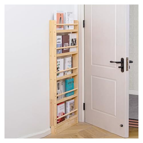 Dörr bakom tidningsorganisatörsställ, 3/4/5 nivå mot väggen ultratunn träbokhylla för inomhus smalt utrymme, slitsad design, naturligt furu (färg: 5 lager, storlek: längd 100 cm/39,4 tum)