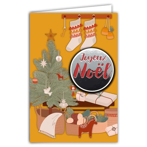 Varmt julkort glänsande textrelief collage med vitt kuvert 12 x 17,5 cm - nordisk skandinavisk dekoration gran paket gåvor strumpor häst korgar illustration bästa önskningar