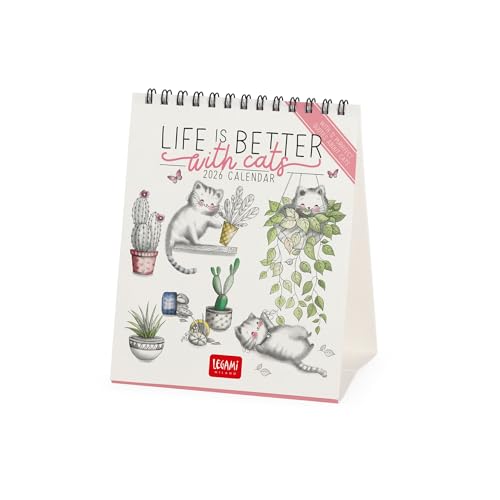 Legami Skrivbordskalender 2026 Sketchy Cats, skrivbordskalender, 12 månader och årlig planerare på engelska, stjärntecken, internationella helgdagar, 12 x 14,5 cm