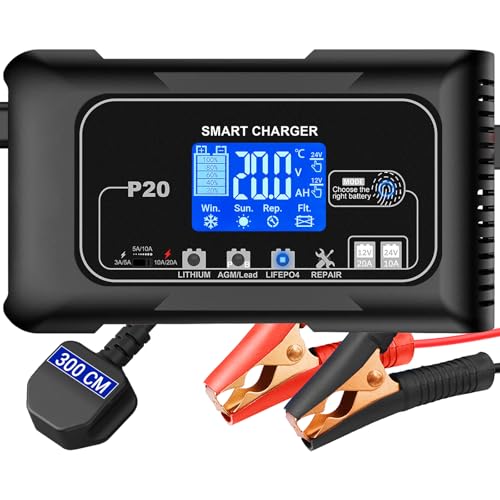 HTRC Billaddare 12V/20A & 24V/10A, billaddare och billaddare, bilbatteriladdare, bilbatteriladdare för Litium, LiFePo4 och sura bly(AGM, GEL, MF, EFB)