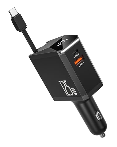 125W Billaddare,Infällbar Billaddare Mobiltelefon Snabbladdare med Type-C Indragbar Kabel,24V 12V Cigarettändar Adapter Uttag Bil Laddare Snabbladdning Retractable Car Charger