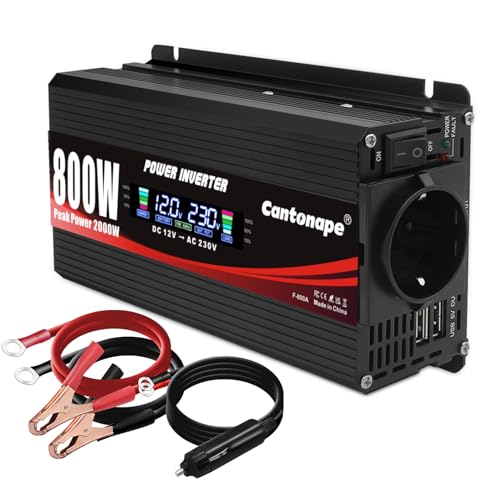 Cantonape Ströminverterare, 800 W/2 000 W topp, DC 12 V till AC 230 V, 240 V, med EU-uttag och LCD-display, spänningsomvandlare med cigarettändaradapter i bil och alligatorklämma för batteri