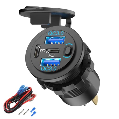 Sanicata USB-uttag 12V PD3.0 USB-C och QC3.0 USB-A Dubbla bil USB-uttag med strömbrytare och vattentät skydd. USB-laddningsuttaget 12V kan installeras i bil, husbil, båt, ATV, UTV,RV...