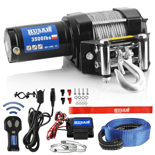Husar Winch Elektrisk Vinsch 12V 3500 lbs | 1587 kg – Slitstark Stålrep 12 meter, Trådlös Fjärrkontroll, Automatisk Broms, Monteringssats – Ideal För Quads Och ATV/UTV + GRATIS ÅTERHÄMTNINGSREM