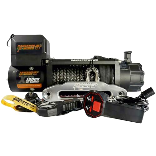 KANGAROO WINCH Snabb elektrisk vinsch 12 V med radiofjärrkontroll – 12 000 pund dragkraft – hållbart plastrep – perfekt för offroad – 4 x 4 skogs- och nyttofordon (K12000XP)