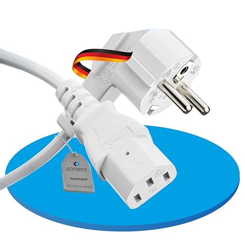 sonero Strömkabel för kallenhetskabel 3-polig, 3,0 m, skyddskontakt Schuko-kontakt kontakt till kallenhetskoppling C13-uttag, 90° vinkel strömkabel nätdel strömkabel för bildskärm PC-skrivare, vit