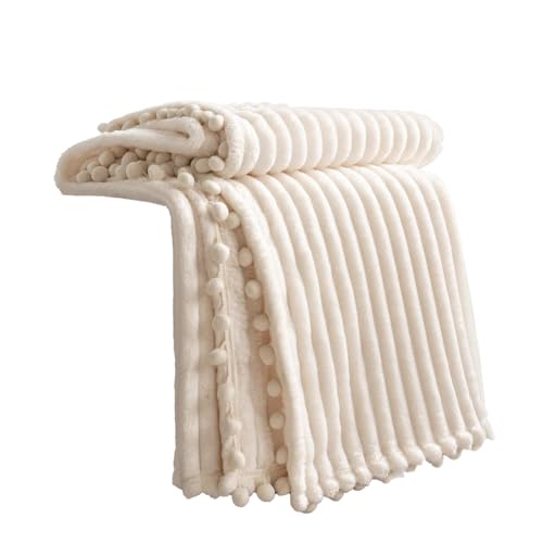 DISSA Fleecefilt, flanellfilt, flanellöverkast, mjuk, fluffig, luddig, varm och mysig plyschfilt, perfekt överkast för soffa, säng och soffa, med franstofsar, 130 x 160 cm, beigefärgad