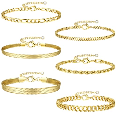 ADRAMATA 7 st kedjearmband för kvinnor, damer, 14K guldpläterade staplingsbara armband, tvinnad ormkedja, justerbar CZ-länk, berlockarmband, roséguld, silver, armbandsset, guld, Adjustable (6.3 to 8.2