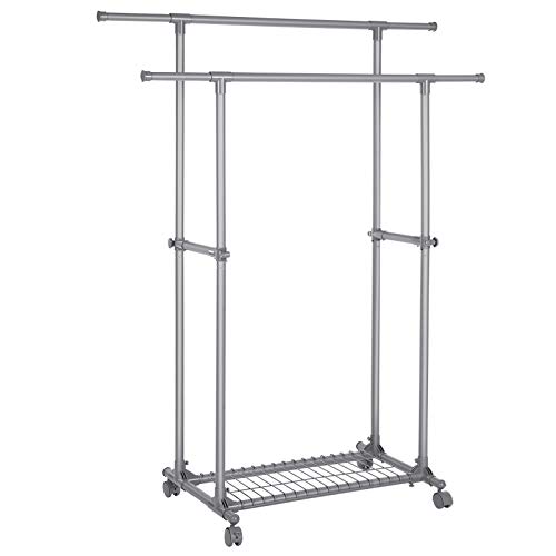 SONGMICS Dubbel stång, klädhållare, mobil, utdragbar mellan 87 och 150 cm, med hjul och förvaringshylla, lastkapacitet 70 kg, för rockar, halsdukar, grå LLR13GY
