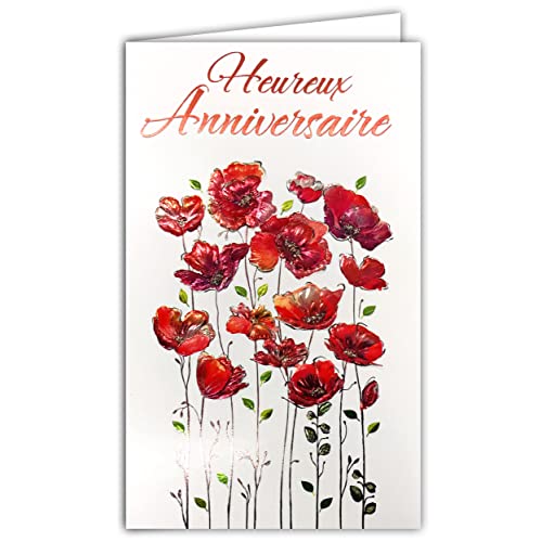 Afie 15-6457 ARGUS illustrerat i Relief kort med vitt kuvert 12 x 19,5 cm glad ANNIVERSARE koppar vallmoblommor röd orange rosa metallisk prägling glänsande papper för kvinnor