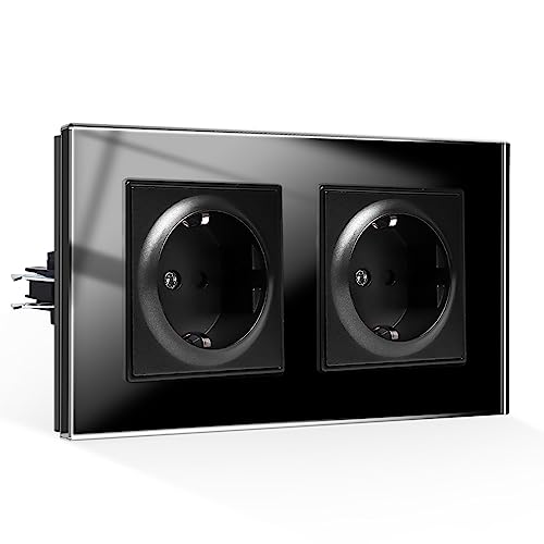 JIMEIDA Dubbeluttag i svart, 16 ampere glas Schuko-uttag infälld skyddskontakt vägguttag – 157 x 86 mm, 250 V, 2-fack