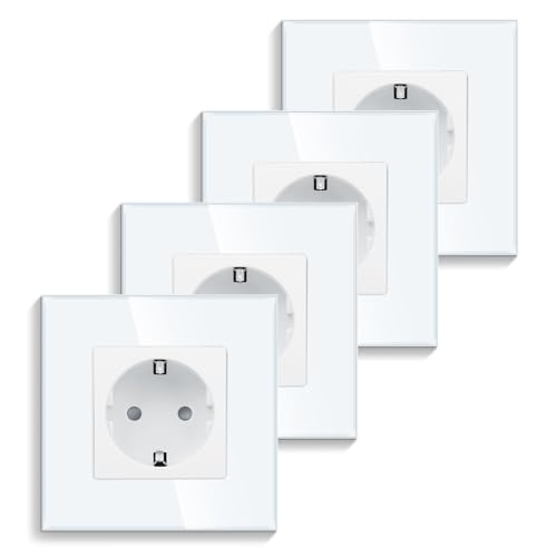 4-pack CNBINGO Schuko-uttag, infälld med klor, enkelt uttag, härdad glasskiva, vit, skyddskontakt, vägguttag, 1-fack, 16 ampere, 250 V