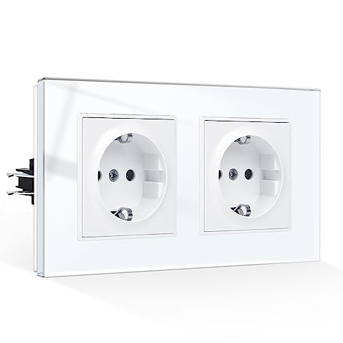 CNBINGO Dubbeluttag infälld med klor, Schuko-uttag härdad glasskiva, vit skyddskontakt vägguttag, 2-fack, 16 ampere, 250 V