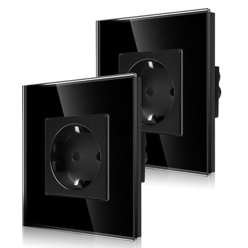 2-pack CNBINGO glas enkeluttag infälld i svart – enkelt Schuko-uttag med barnsäkring – 16 ampere skyddskontakt vägguttag med glasram