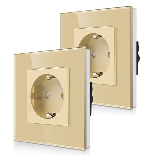 2-pack CNBINGO glas enkeluttag infälld i guld – enkelt Schuko-uttag med barnsäkring – 16 ampere skyddskontakt vägguttag med glasram