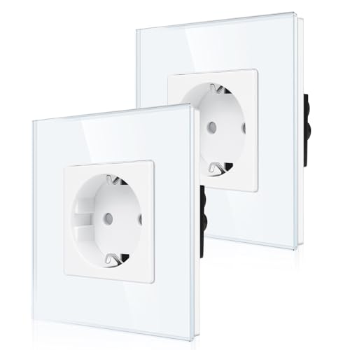 2-pack CNBINGO glas enkeluttag infälld i vitt – enkelt Schuko-uttag med barnsäkring – 16 ampere skyddskontakt vägguttag med glasram
