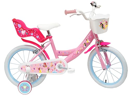 Disney Princess Girl Bike 16 tum utrustad med 2 bromsar, framkorg, bakre dockhållare, stänkskärmar och stabilisatorer, rosa